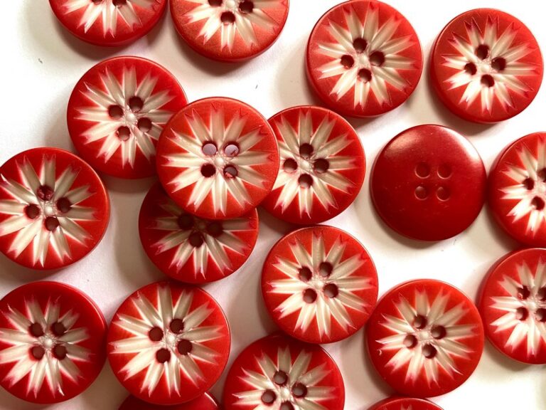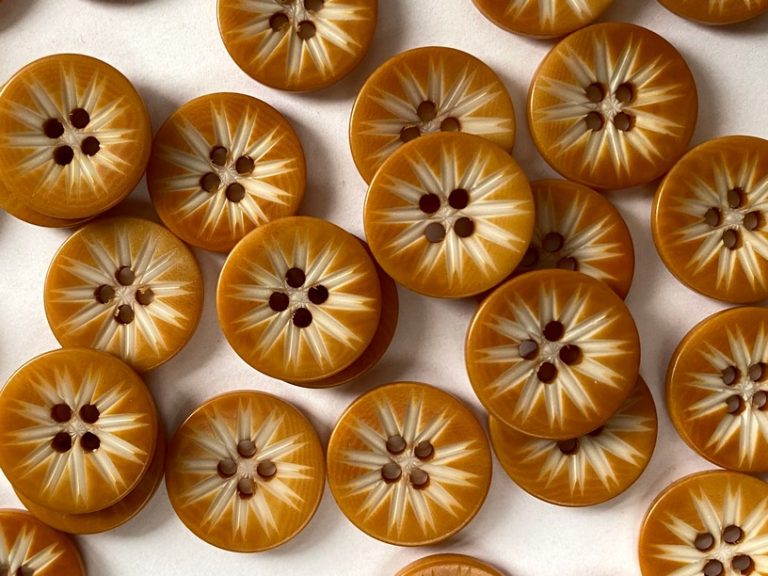 Round button with 4 holes. Large curved bead with a pretty floral pattern.