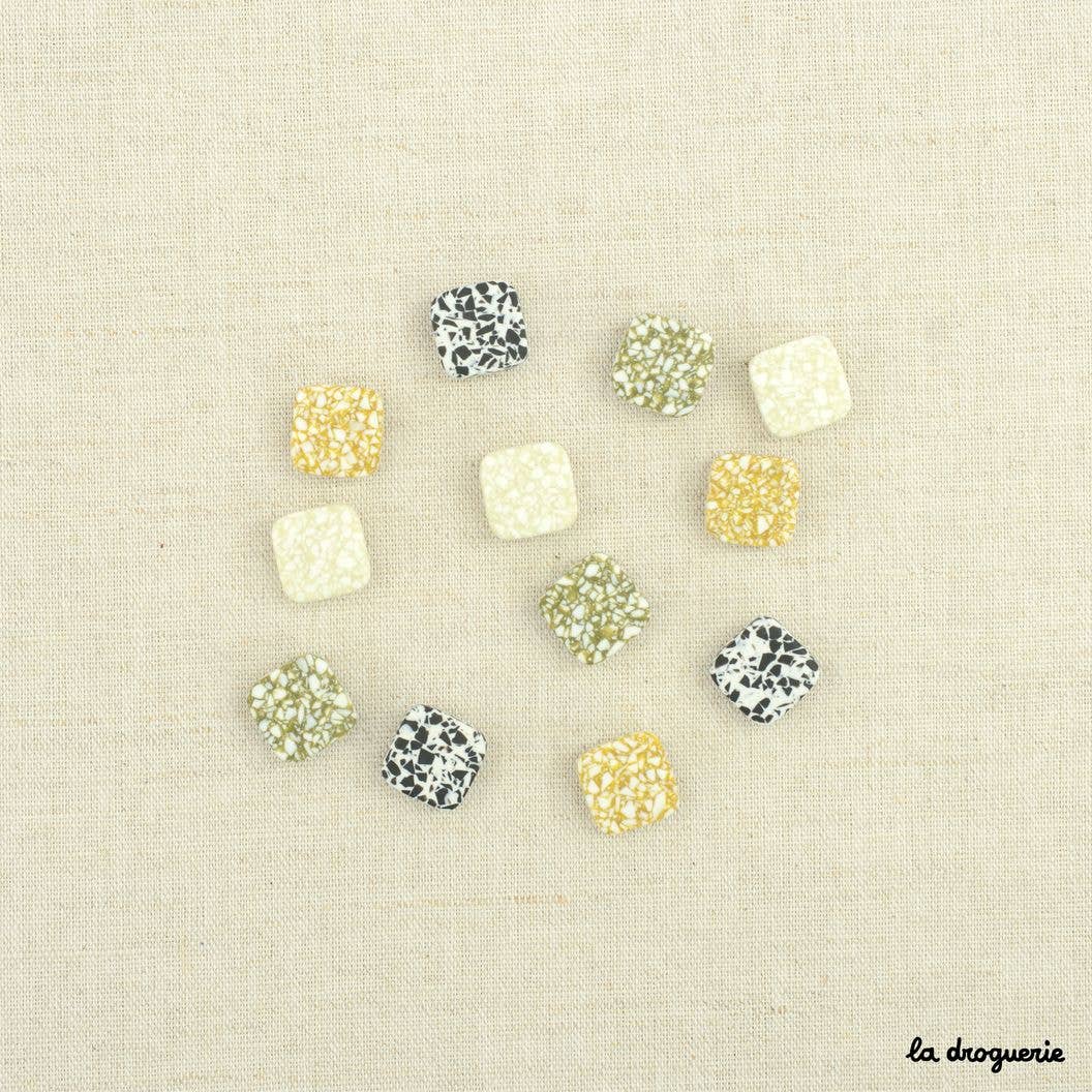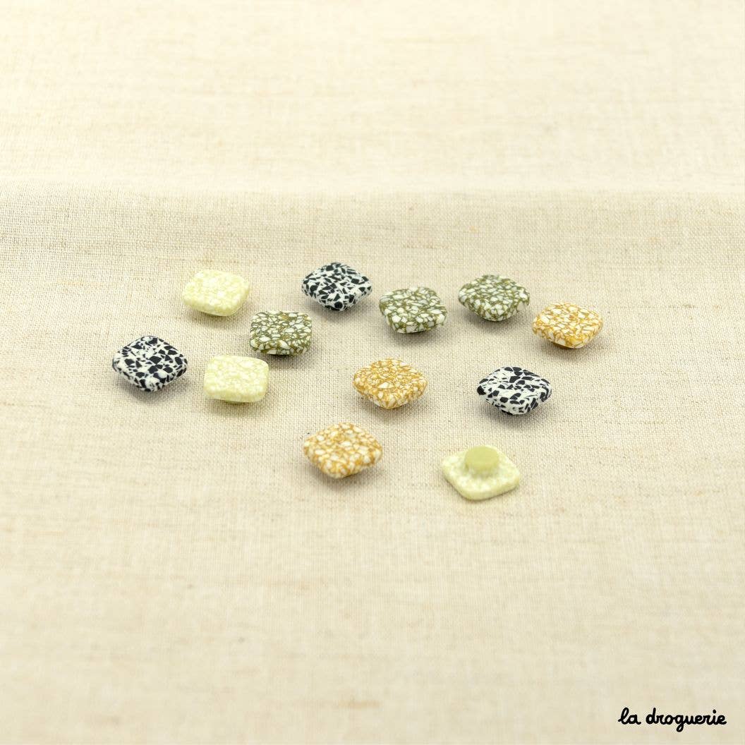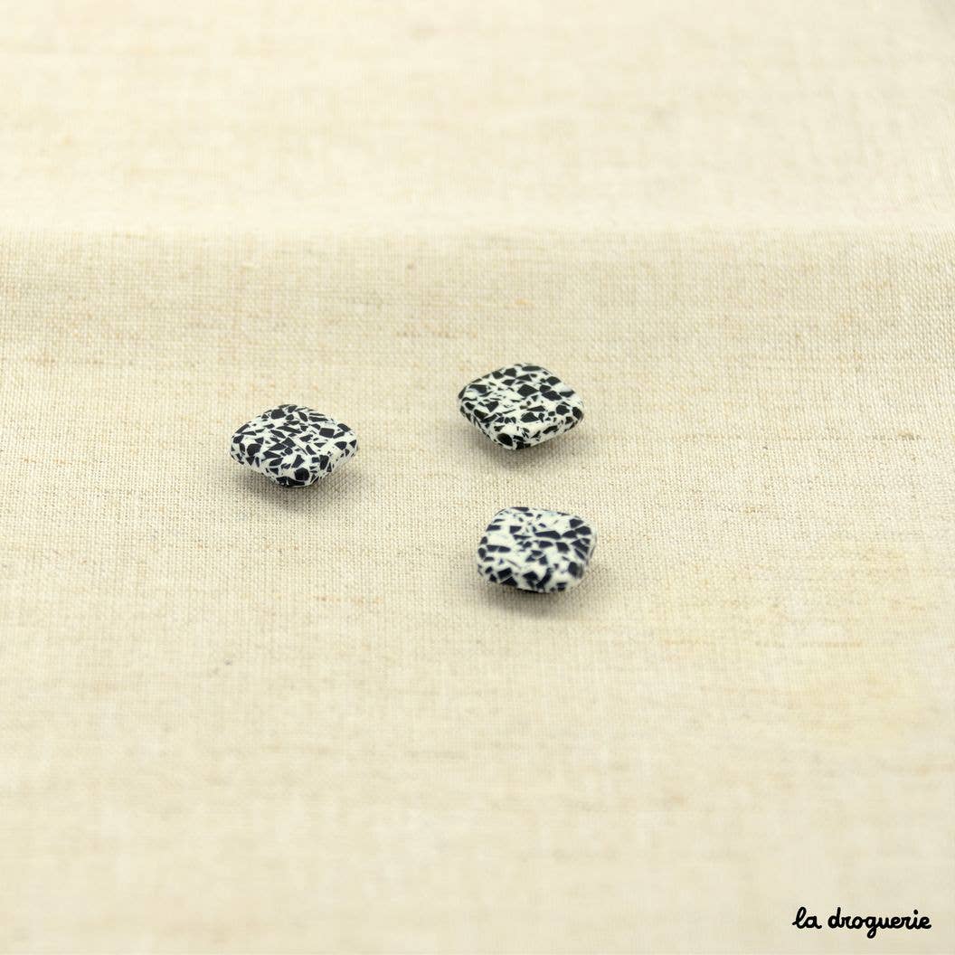 Two-tone Terrazzo-style square foot button. Kind of a small mosaic. Not very big, it is perfect for thin blouses or vests. A bit retro, this original button will also be perfect for accessorizing a vintage piece.