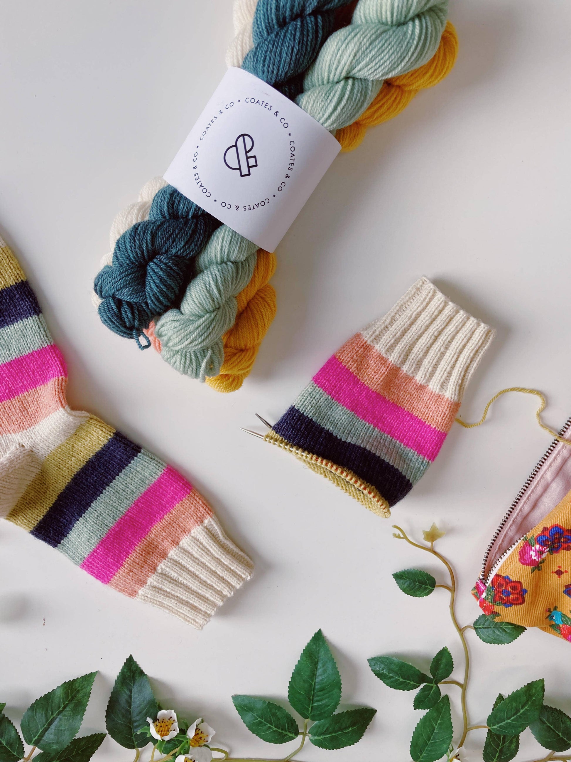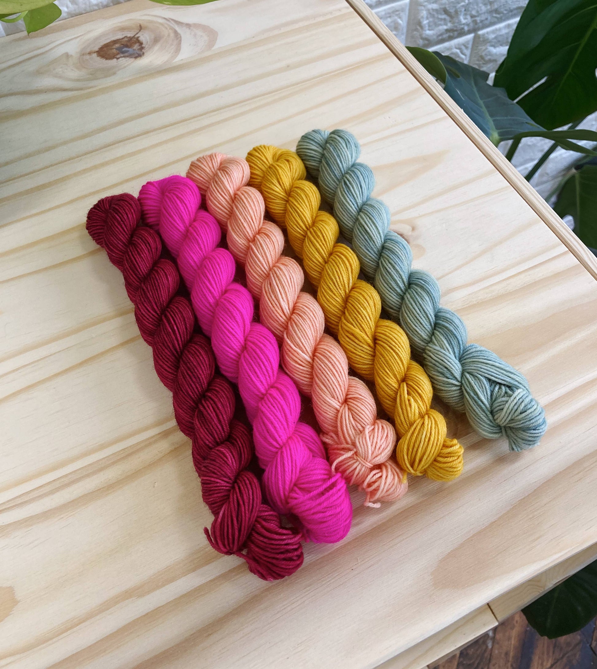 This set includes five hand-dyed mini skeins on our Cottage Sock yarn base. Perfect for socks or other cute colorful projects!