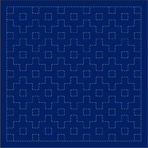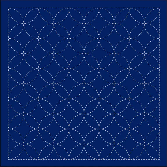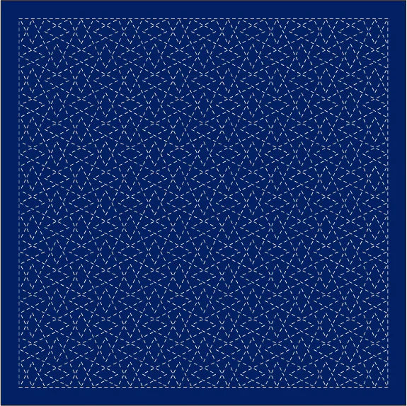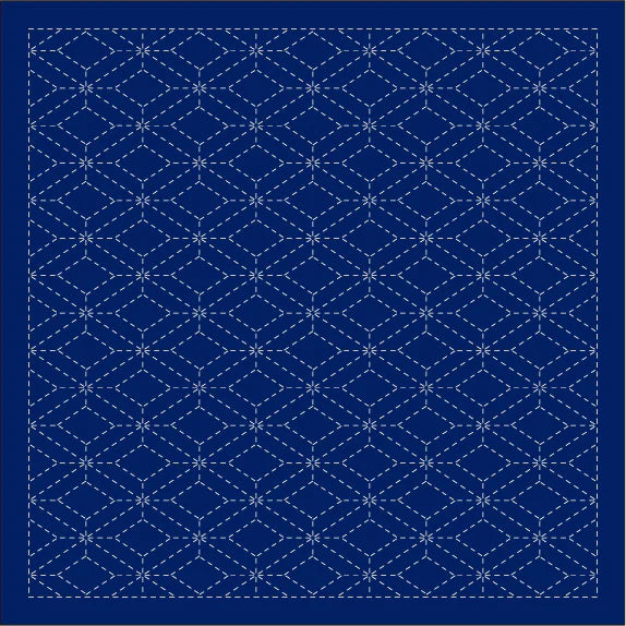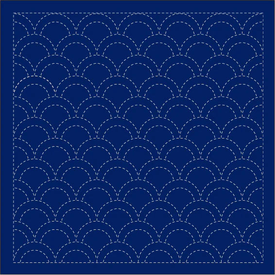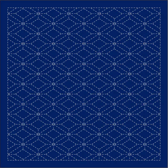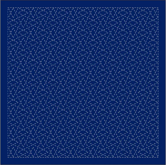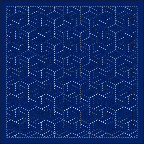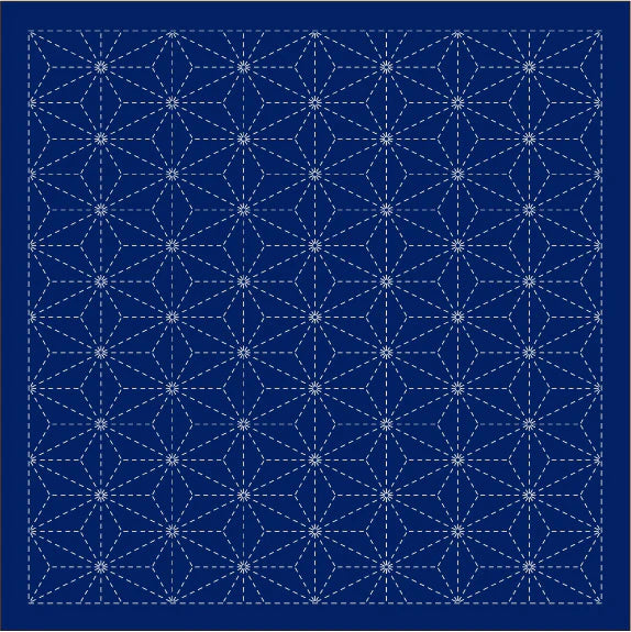 Continuous Traditional Patterns: traditional sashiko patterns including Wave Crest/SEIGAIHA, Hemp Leaf/ASANOHA, and Seven Treasures/SHIPPO-TSUNAGI. Available in white or navy.