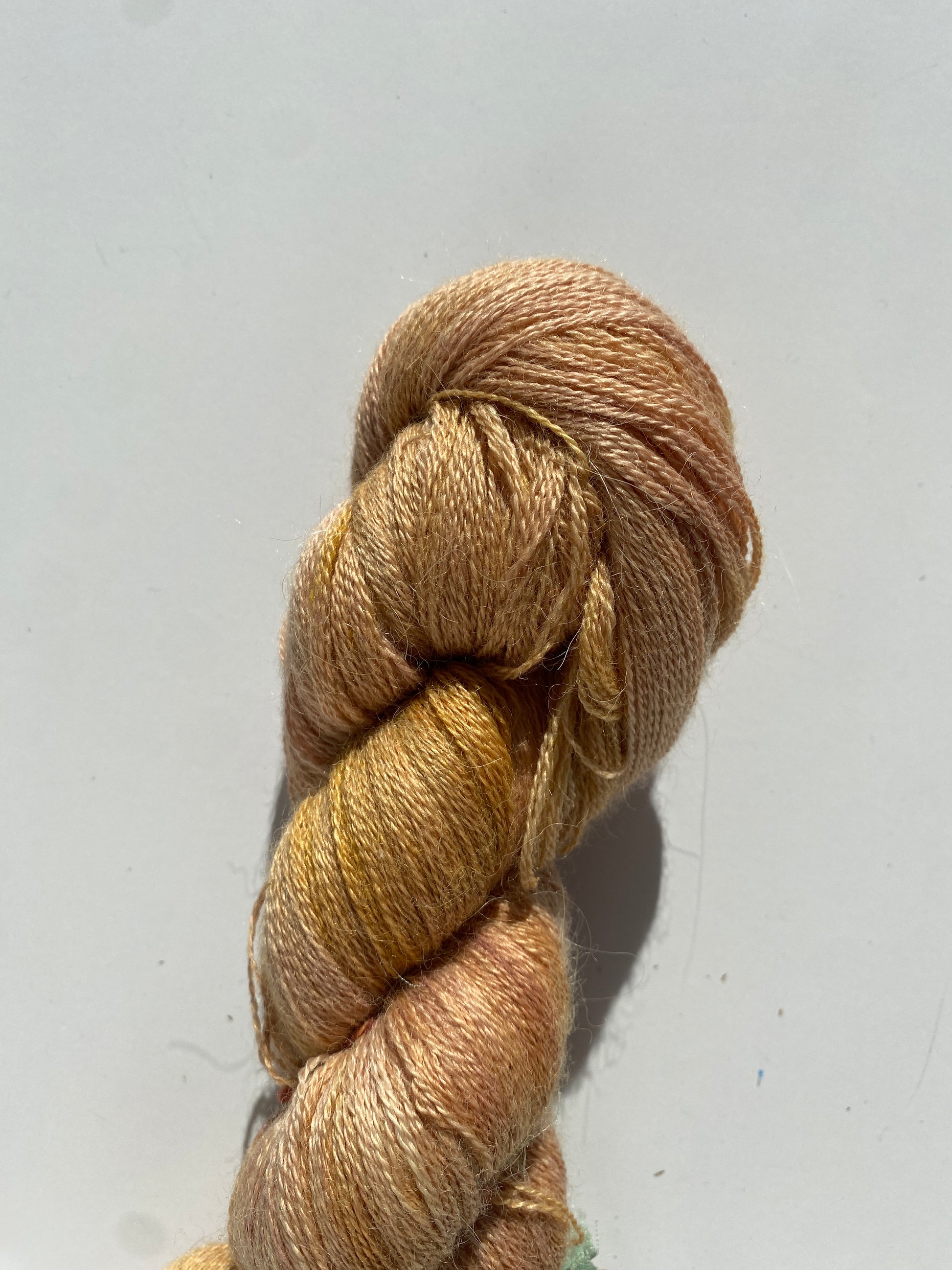 Rebecca from Orchard Acres Textiles dyes these beautiful skeins with 100% natural plant material. Each skein is unique, and the colors are stunning. She lives on her beautiful farm outside of Rochester, MN, surrounded by goats, sheep, and plants.