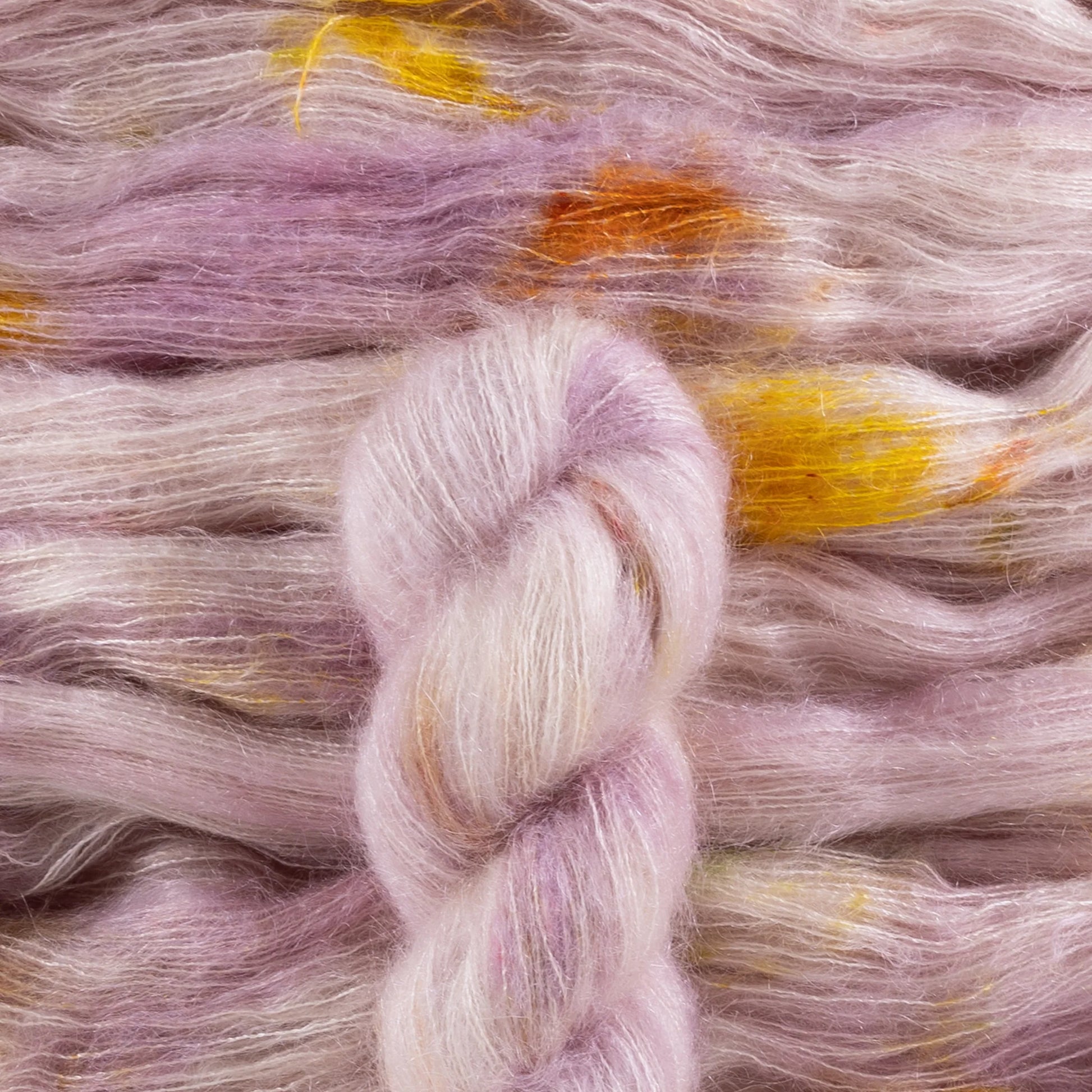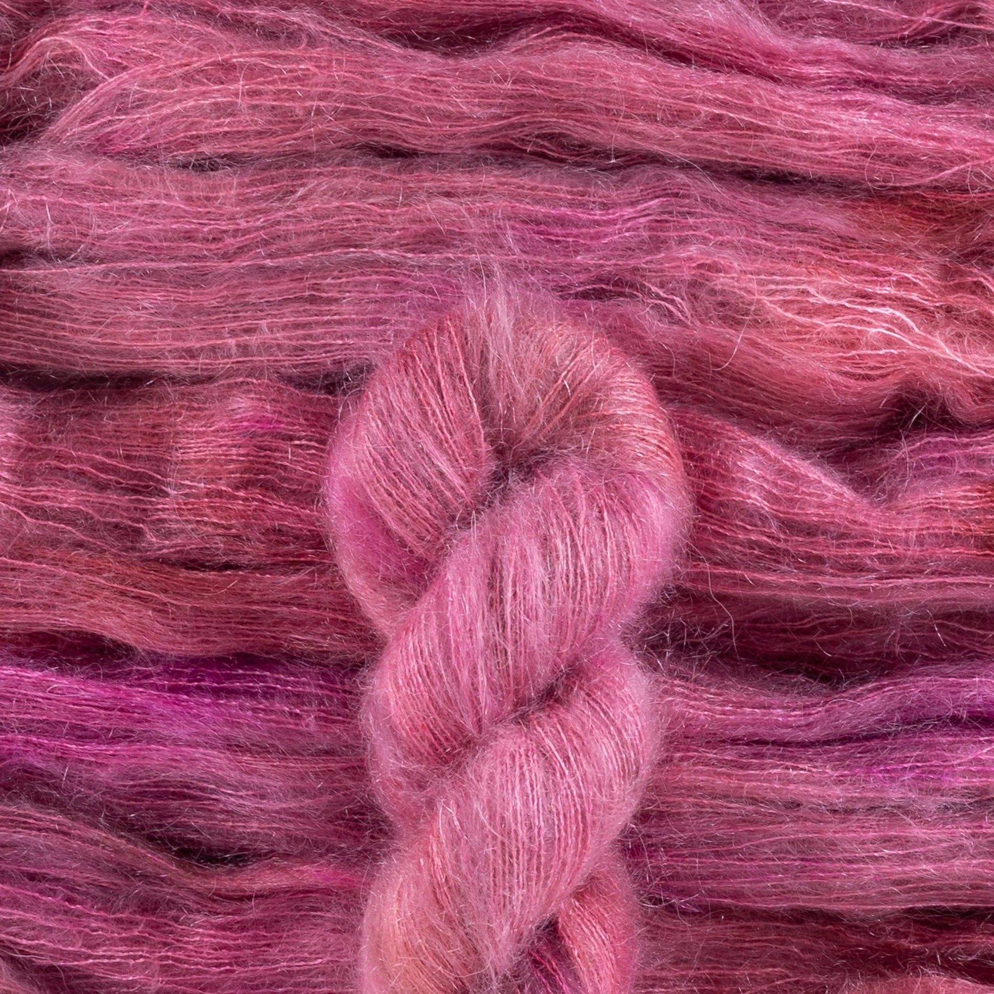 The combination of mohair and silk creates a shiny, airy, strong fiber. The dye takes to both very well and creates a stunning effect. The silk core sometimes glows amid the wispy mohair. It is soft and fluffy, with a generous halo.