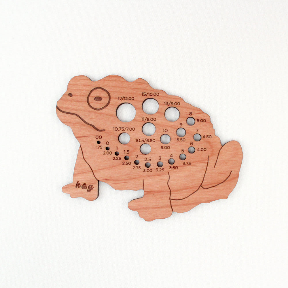 A multifunctional gauge tool that has knitting needle and crochet hook measuring on the cap and a 2 inch project gauge window on the stem. This gauge tool has purpose and a fun original design! Measure knitting needles and crochet hooks with sizes starting at 1.75 mm up to 12 mm. Designed and made in Minnesota, thick alder wood, sealed for lasting quality. A must have for every project bag or fiber tool kit.