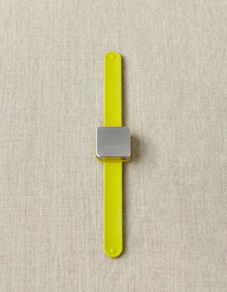 Strong magnet on a silicone bracelet, to keep your metal stitch markers, row counter, and other tools close at hand. Silicone slap bracelet - Brushed steel-plated magnet - Measuring lines for inches & centimeters on the underside - Fits any size wrist - Dimensions: bracelet: 10" × ¾" & magnet: 1½" × 1½" You can wear it, or simply drop it in your knitting tool bag to keep all the tools together – or even unfurl it and push the magnet to one end to use it as a straight edge while reading down a pattern. In addition to knitting, we use ours for sewing (it’s great for holding pins!) and we have heard from customers who have used their MK for holding paper clips at work, hairpins (especially while doing hair for weddings!), nails and screws while working around the house, and even for fly fishing!