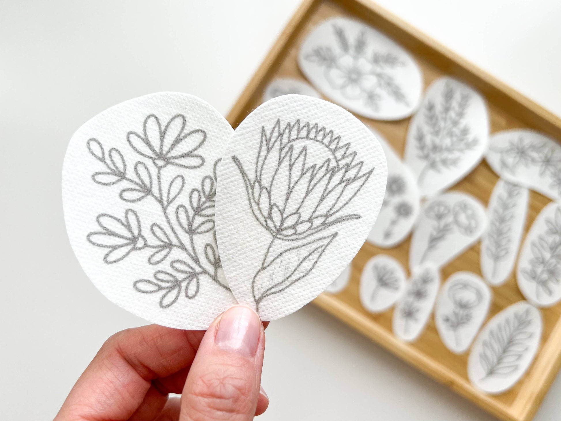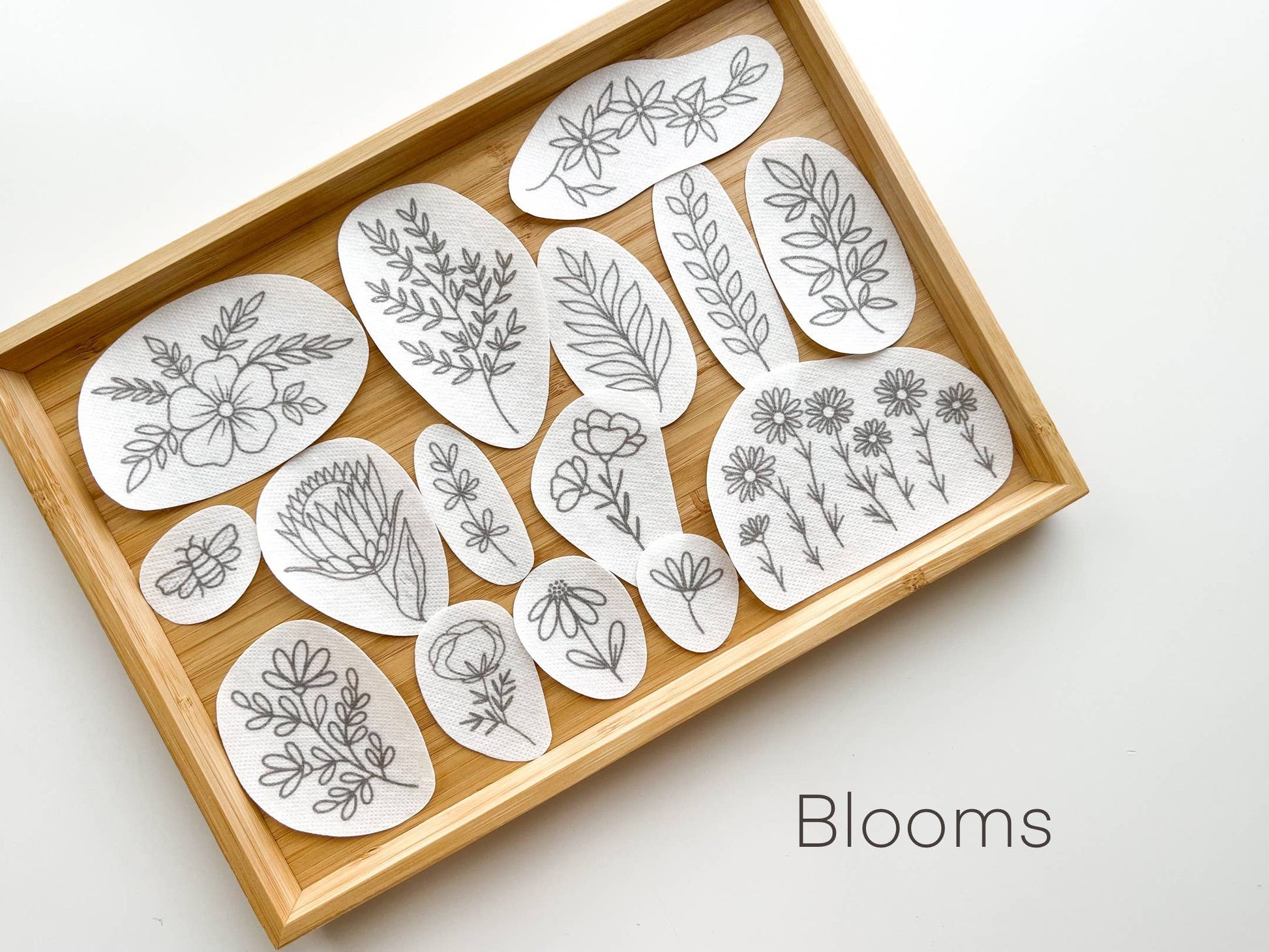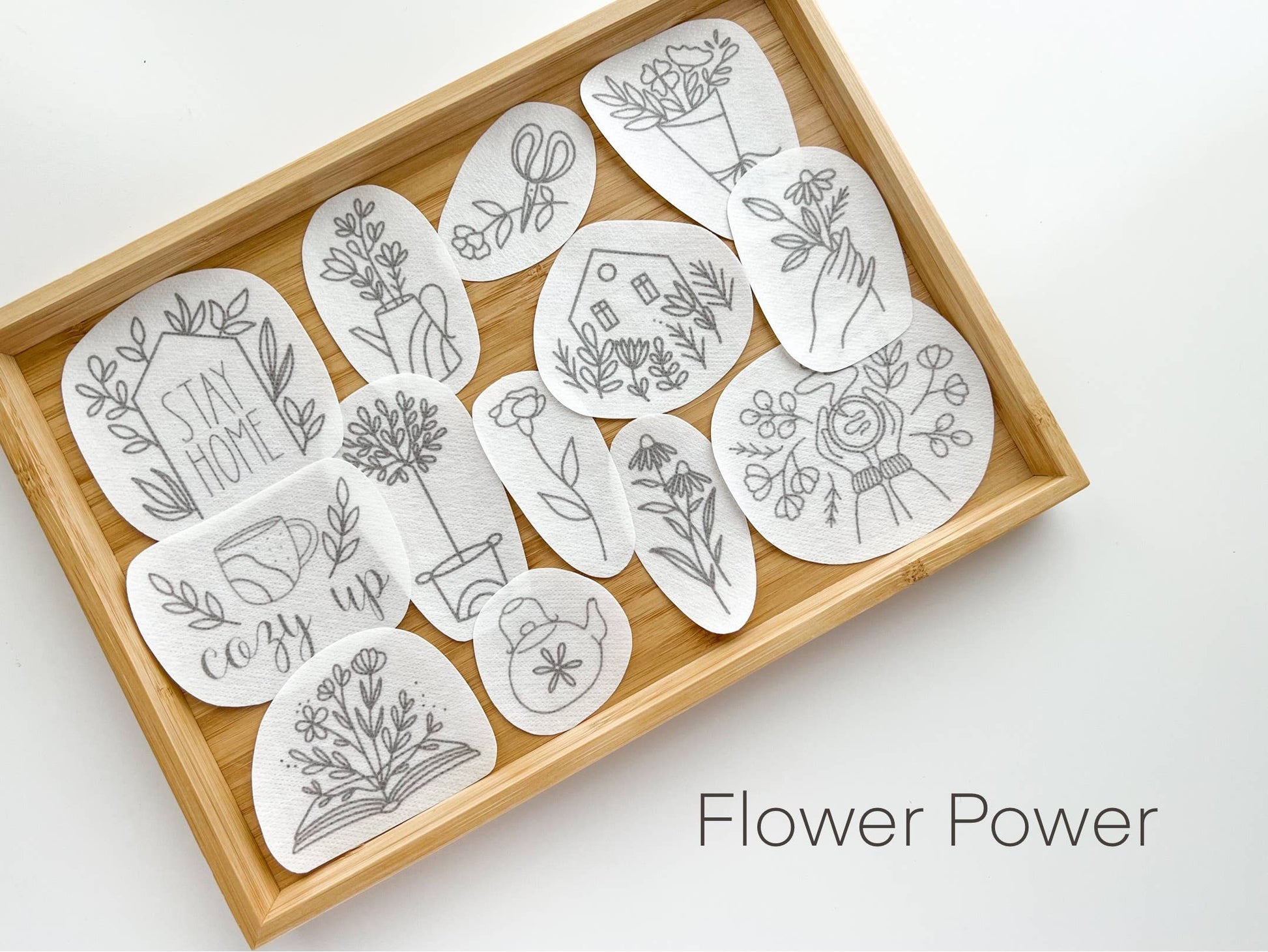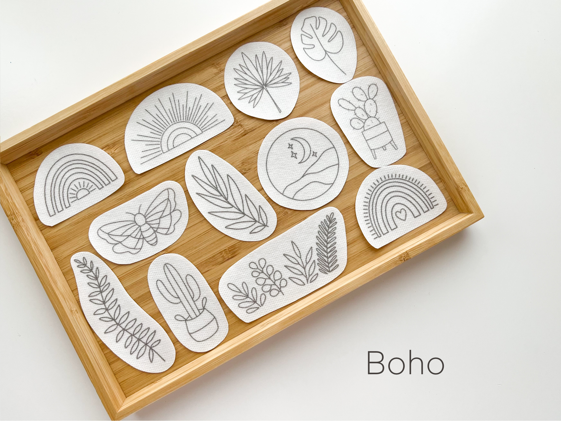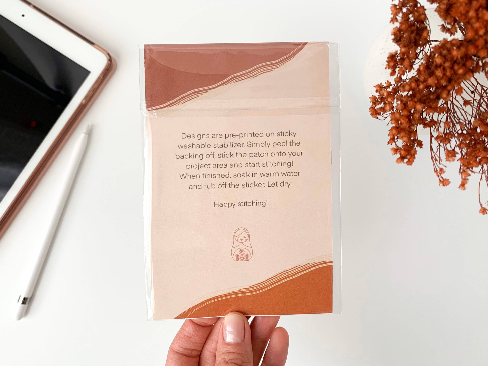 Designs are pre-printed on sticky washable stabilizer. Each one is a single-use pattern patch. Simply peel the backing off, stick the patch onto your project area and start stitching! When finished, soak in warm water to dissolve the paper, gently rub it off, and let dry.